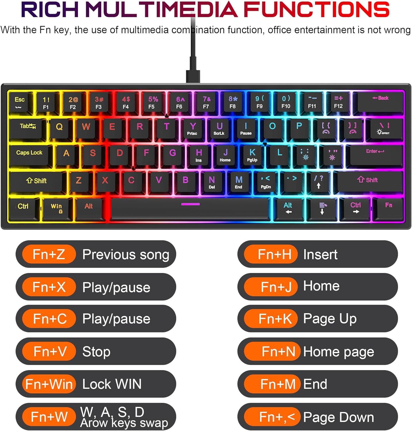 Media Keys: 12 Multimedia shortcuts via Fn + F1-F12 (Volume control, Play/Pause, Email, etc.).