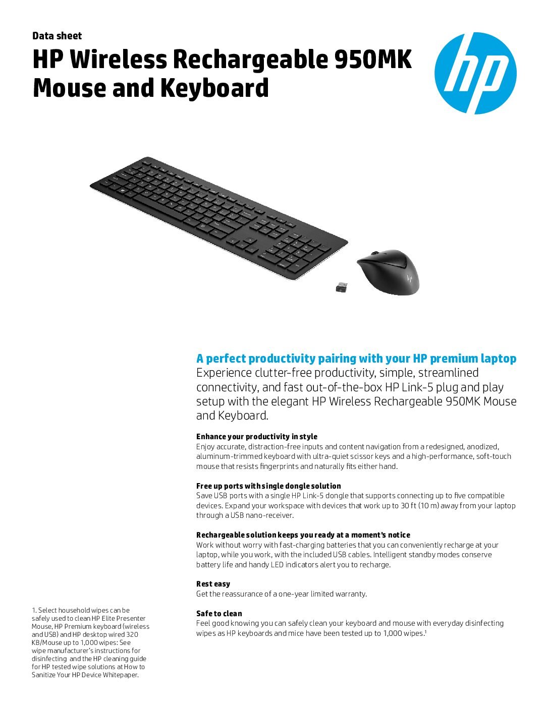 The HP 950MK Wireless Rechargeable Keyboard and Mouse Set (Part Number: 3M165AA) is a premium, professional-grade combo designed for productivity and style, featuring an anodized aluminum-trimmed keyboard and high-performance laser mouse.