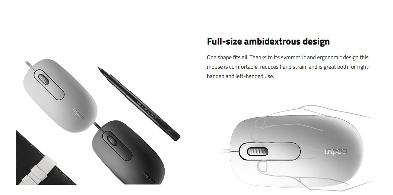• Ambidextrous: A completely symmetrical, full-size shape that is comfortable for both right- and left-handed users.