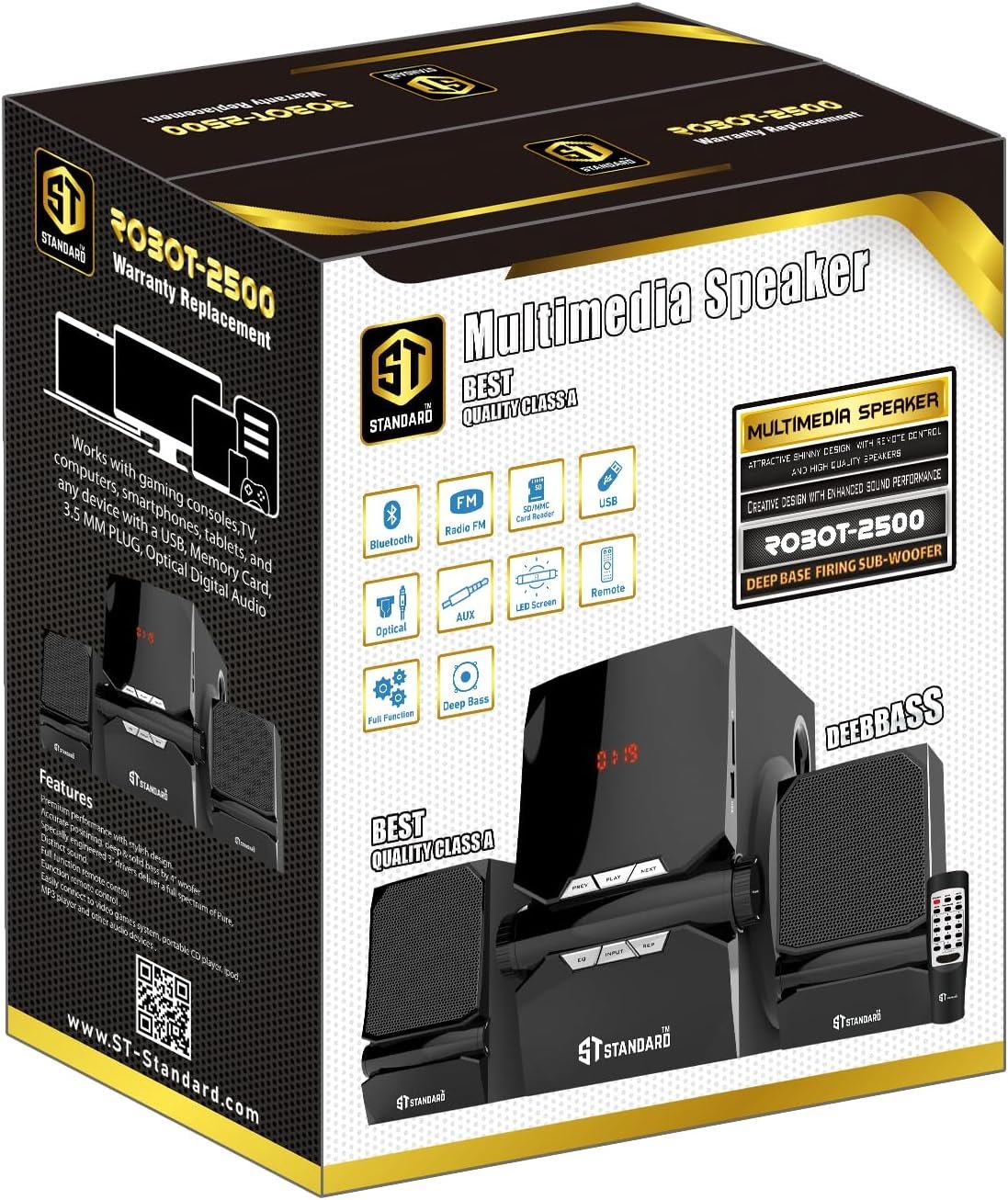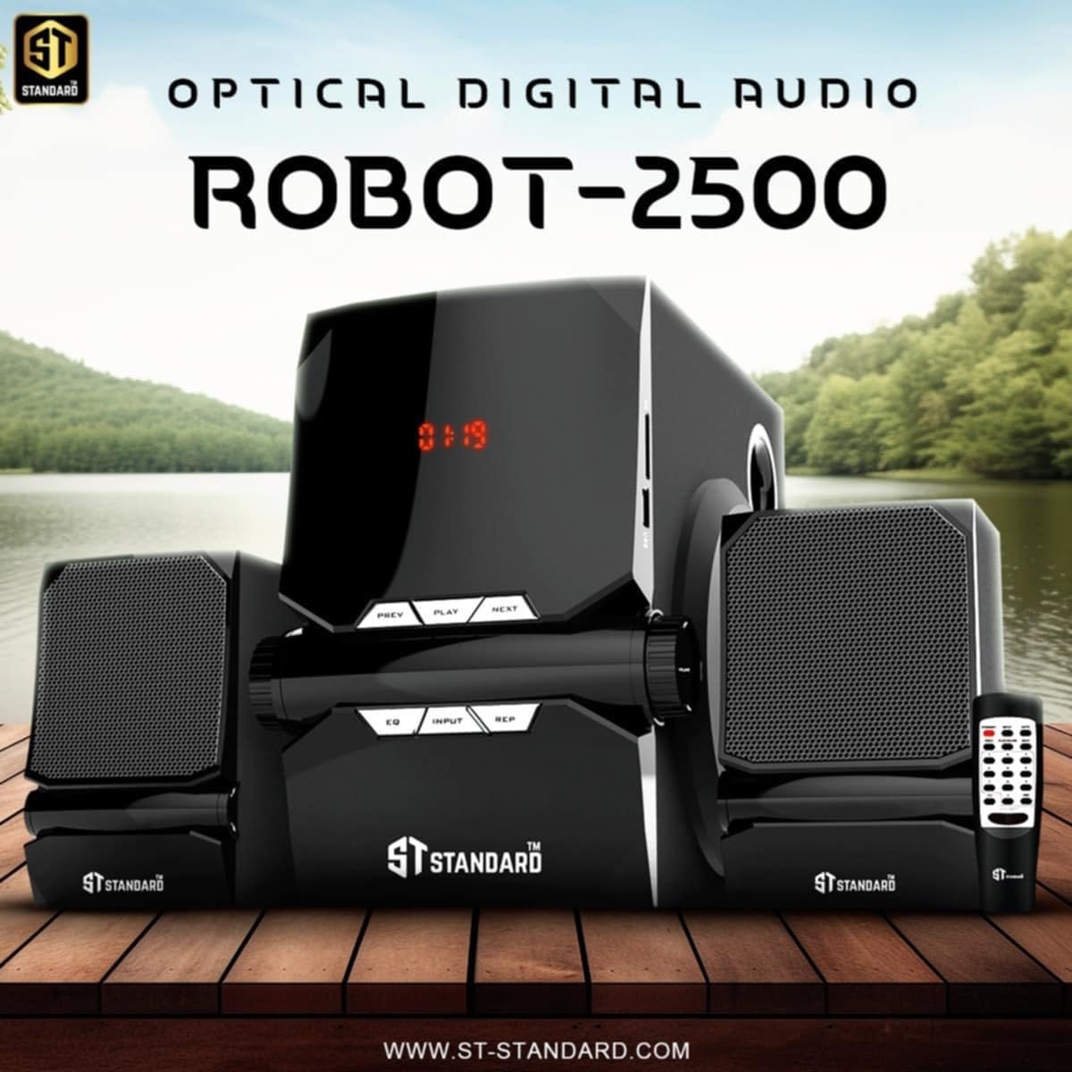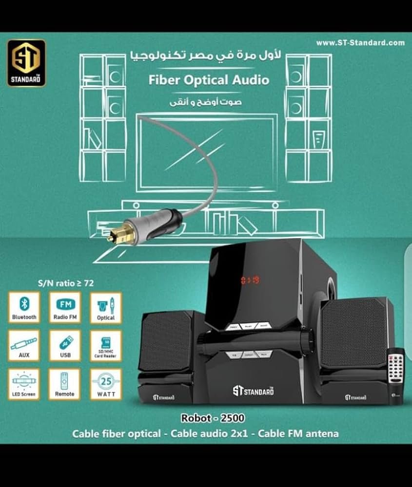 The ST Standard ROBOT 2500 is a 2.1-channel multimedia speaker system known for its “Robot” inspired aesthetic and integrated digital inputs. It is designed to offer a balance of power and modern connectivity for home entertainment and office setups.